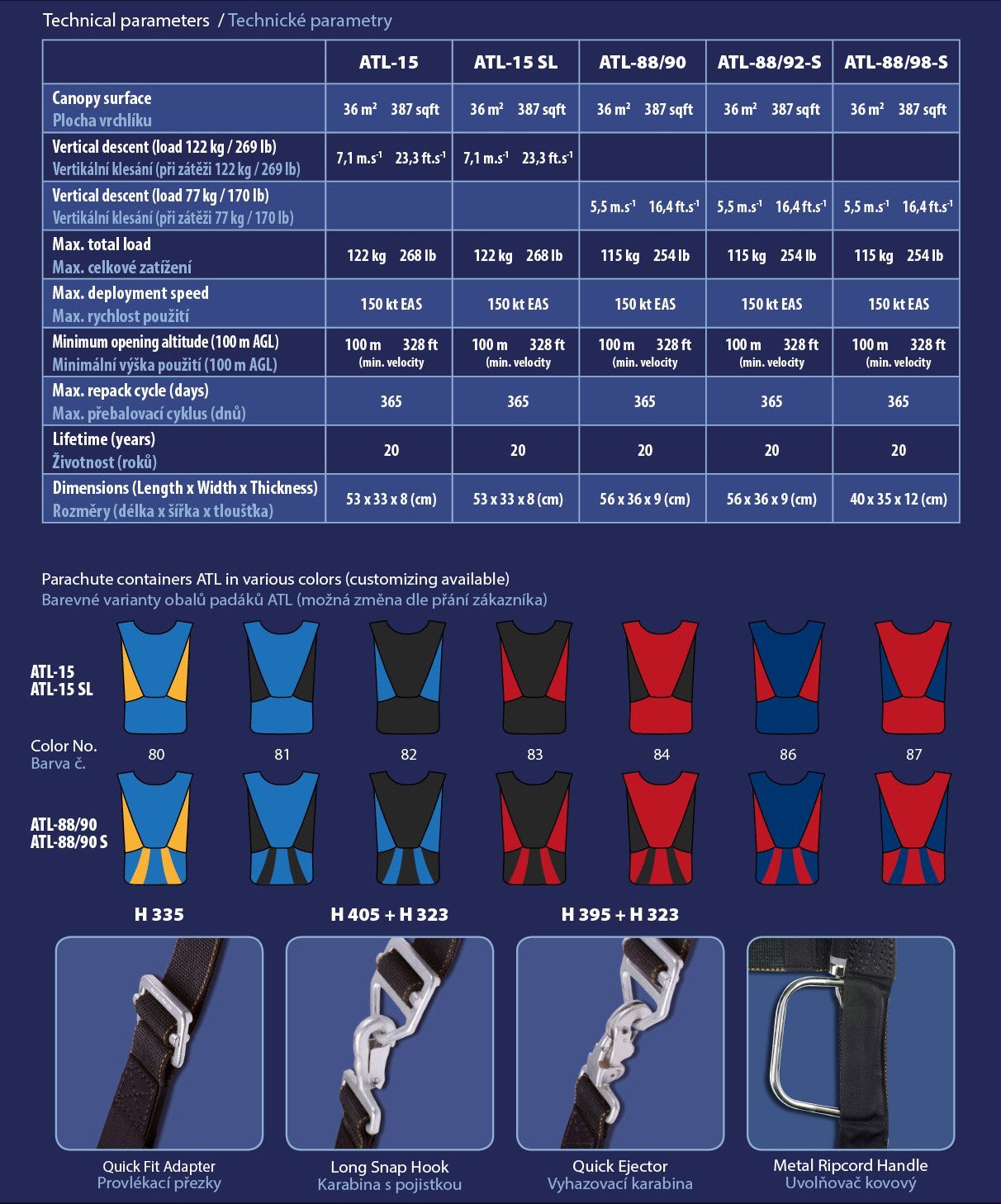 The parachutes meet the requirements of ETSO C23d and SAE AS8015B.